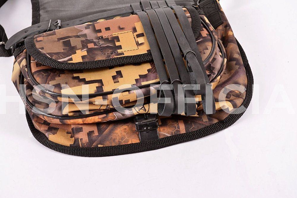 В сумке есть специальный сетчатый мешок для дичи. В производстве применяют итальянскую фурнитуру, почти не звенящую и не бликующую, а раскрой изделия выполняется на специальном для этого оборудовании, что обеспечивает отличное качество. Ягдташ состоит из двух отделений, дополнительного кармана для хранения документов и двух патронашей, каждый рассчитан на 18 патронов, также имеет подвеску Утятницу. Ягдташ украшен с помощью миниатюр на тему охоты.